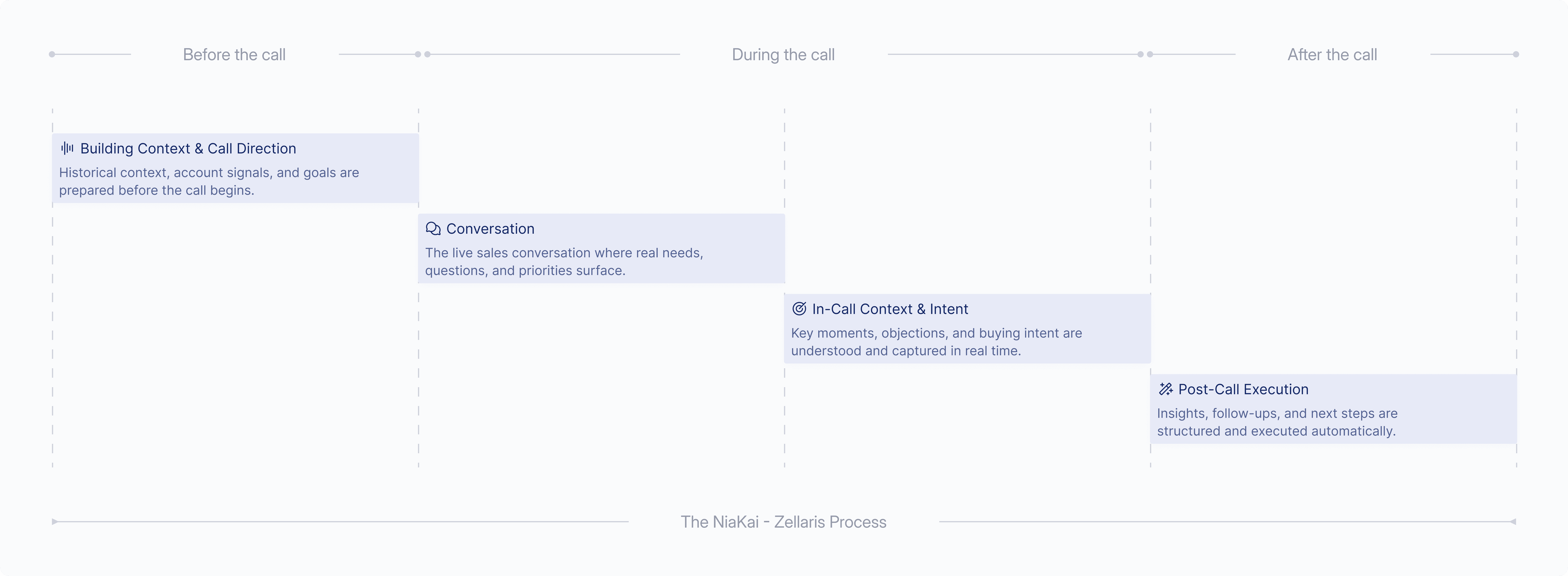 Sales conversations carry intent, objections, and buying signals. NiaKai captures this context in real time and ensures it flows seamlessly into decisions, follow-ups, and outcomes - without manual intervention.